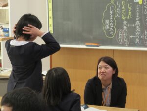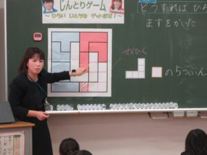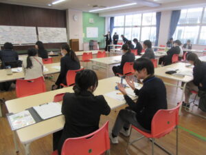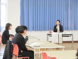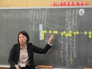 指導助言者の先生には、本時に至るまでの授業の積み重ね、一貫したねらいのある授業構想、授業者の一人一人の考えを大切に受け止める板書や問い返し等について、価値付けていただきました。また、発問の役割や振り返りの大切さについても教えていただきました。